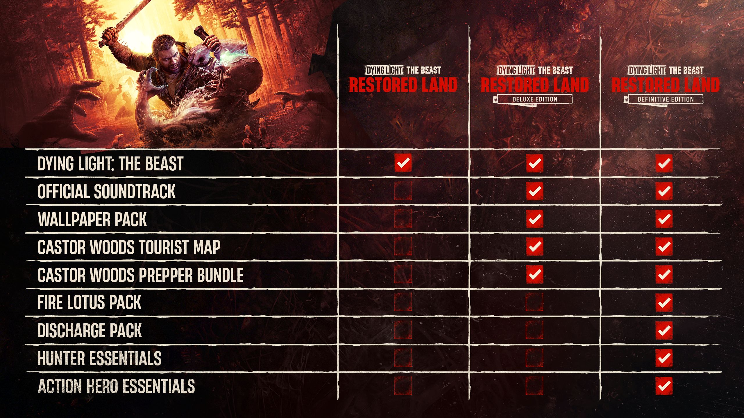《消逝的光芒:野兽》Restored Land有三个版本 - 标准版、豪华版和终极版。请查看附带的图表以了解每个版本包含的内容。