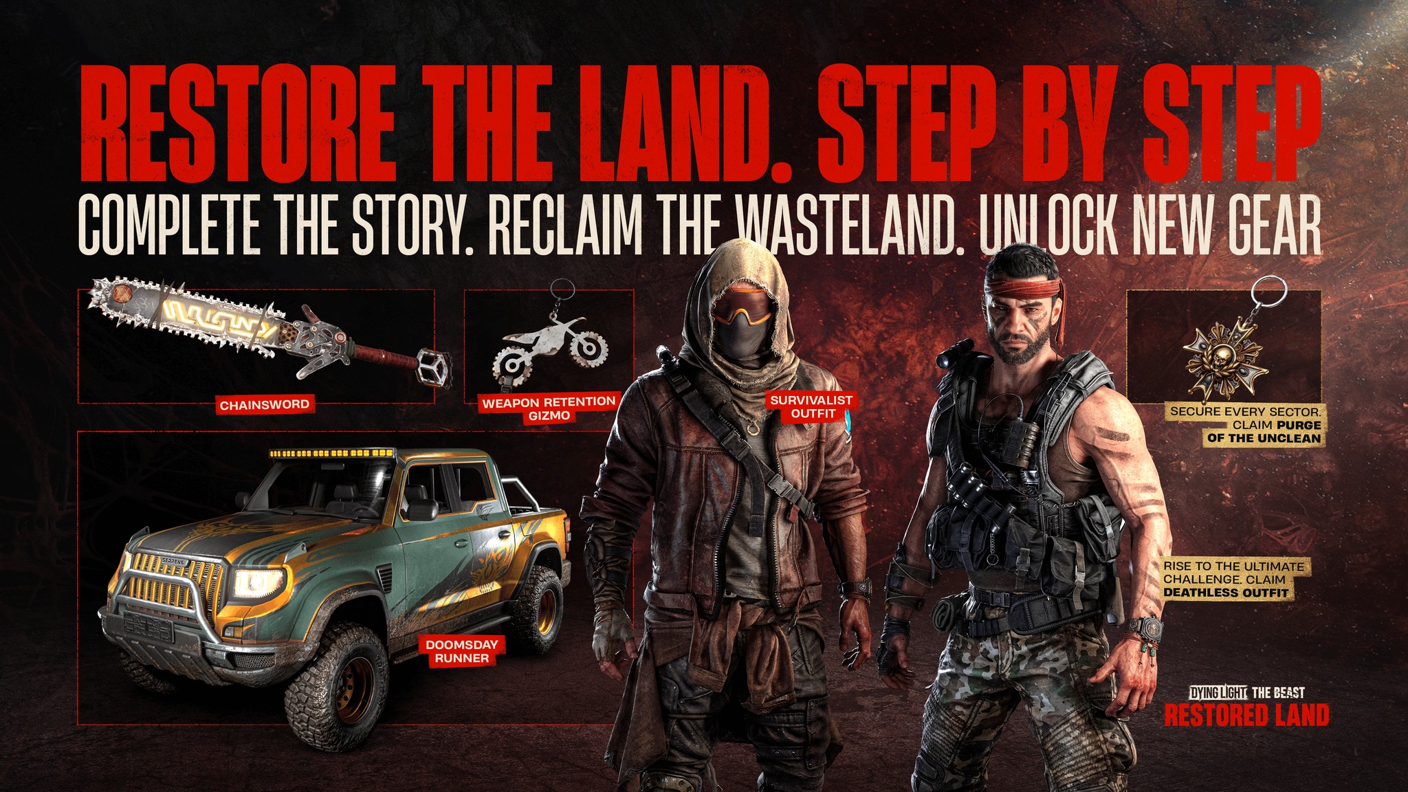 完成Restored Land体验中的主线故事将解锁一整套生存装备,包括Survivalist Outfit、毁灭Chainsword、Doomsday Runner载具皮肤和Weapon Retention Gizmo Charm。